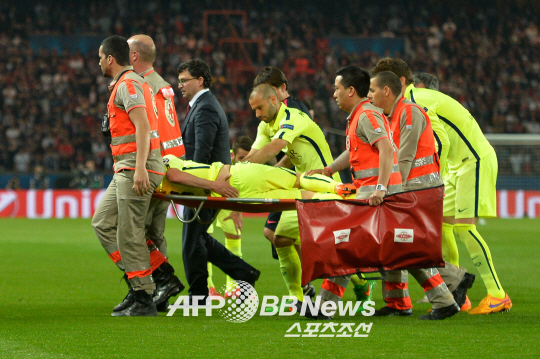 | 들것에 실려나가는 이니에스타. ⓒAFPBBNews = News1 |
