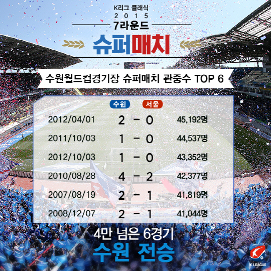 국제축구연맹(FIFA)이 선정한 세계 7대 더비 중 하나인 슈퍼매치는 73번째 무대를 맞이한다. 최고의 라이벌전, 빅매치의 수식어가 아깝지 않을 슈퍼매치는 오래딘 역사만큼 기록도 다양하다. 슈퍼매치의 재미를 두 배로 만들어 줄 '기록 열전'을 살펴봤다.