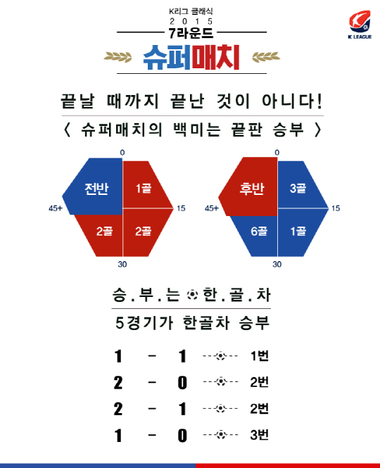 슈퍼매치의 백미는 끝판승부다. 경기 종료 휘슬이 울릴 때까지 안심할 수가 없다. 서 감독과 최 감독이 벌인 최근 8차례 슈퍼매치에서 가장 많은 골이 터진 시간도 경기 후반이었다. 8경기에서 터진 총 15골 중 10골이 후반에 터졌다. 이 중 6골이 후반 30분 이후에 나오는 끝판승부가 펼쳐졌다. 8차례 맞대결에서 주목할 점은 한 골차 승부가 5번이나 된다는 것이다. 치열한 슈퍼매치의 세계다.