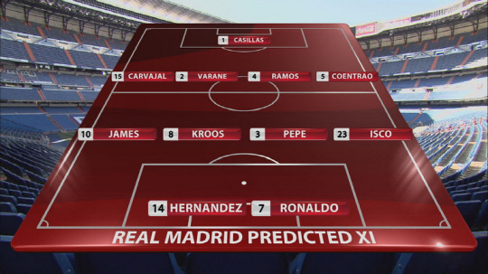 레알 마드리드는 루카 모드리치, 가레스 베일, 카림 벤제마가 잇따라 부상으로 빠지는 데다 마르셀루도 징계로 출전할 수 없어 주력 선수 중 무려 4명이 결장한다. 발라그는 안첼로티 감독이 이 같은 전력 공백을 최소화하기 위해 하비에르 에르난데스(치차리토)와 크리스티아누 호날두를 최전방 투톱으로 두는 4-4-2 전술을 구사할 것이라고 설명했다.