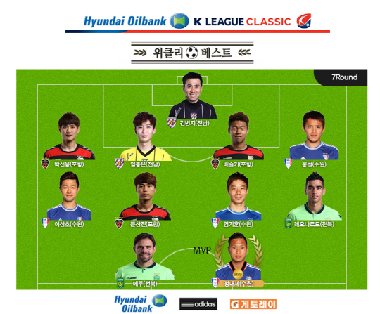 정대세와 함께 전북의 에두가 최고의 공격수에 이름을 올렸다. 전북의 22경기 무패 신기록을 만든 주인공 레오나르도(전북)와 '왼발의 마법사' 염기훈 이상호(이상 수원), 문창진(포항)이 7라운드 베스트 미드필더에 선정됐다. 최고의 수비수 부문에는 홍 철(수원) 배슬기 박선용(이상 포항) 임종은(전남)이 뽑혔다. 7라운드 최고의 거미손은 김병지(전남)였다.