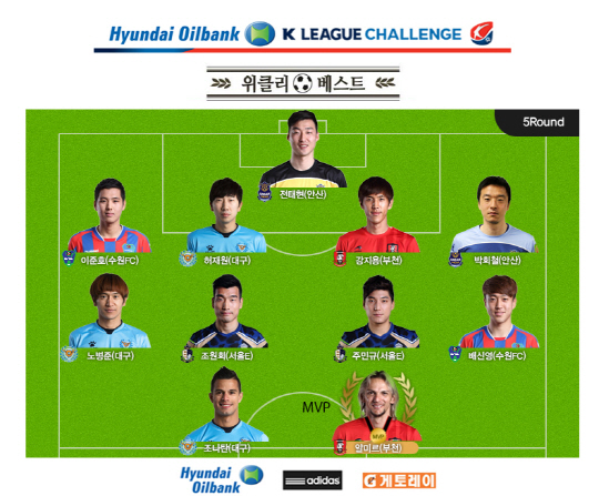 한편, 챌린지 5라운드에서는 부천의 알미르가 주간 MVP에 선정됐다. 알미르를 앞세운 부천은 챌린지의 우승후보 상주를 3대1로 꺾는 이변을 일으켰다. 연맹은 알미르에 대해 '빠른 스피드를 무기로 최전방에서 상대 공략, 이타적인 플레이로 결승골 기회 창출해 승리 주도'라고 평가했다. 이밖에 조나탄(대구·이상 FW),배신영(수원FC) 주민규 조원희(이상 서울 이랜드) 노병준(대구·이상 MF) 박희철(안산) 강지용(부천) 허재원(대구) 이준호(수원FC·이상 DF) 전태현(안산·GK)이 챌린지 5라운드 위클리베스트에 이름을 올렸다.