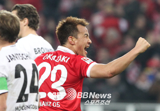일본 대표팀의 공격수인 오카자키는 2010~2011시즌 슈투트가르트로 이적해 독일 분데스리가에 데뷔했다. 이후 2013~2014시즌 마인츠로 이적해 두 시즌 연속 두자릿수 득점에 성공했다. 지난 시즌 리그에서 15골을 넣은 그는 올시즌 12골로 팀 공격을 이끌고 있다.