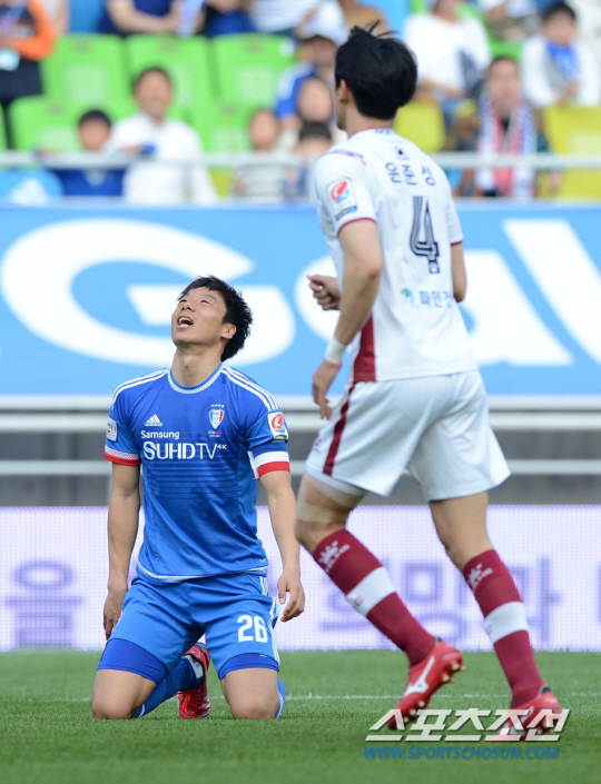 수원 삼성과 대전 시티즌의 K리그 클래식 2015 8라운드 경기가 26일 수원월드컵경기장에서 열렸다. 수원 염기훈이 슛팅찬스를 놓친 후 아쉬워하고 있다. 9경기 연속 무패(6승 3무)행진을 달리고 있는 수원은 현재 4승 2무 1패 승점 14점으로 2위, 대전은 1무 6패 승점 1점으로 리그 최하위를 기록중이다. 수원=허상욱 기자 wook@sportschosun.com/2015.04.26/ |