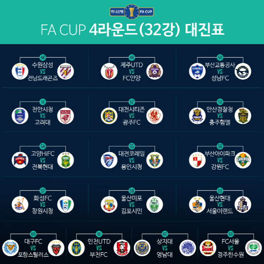 한편, 29일 팀 사정에 의해 경기를 치르지 못하는 3경기는 다음달 12일과 13일에 열린다. 화성FC가 창원시청과 12일 대결한다. 수원과 전남의 '클래식 더비'는 13일 수원월드컵경기장에서 열린다. 같은날, 울산현대미포조선과 김포시민축구단도 16강행 티켓을 두고 울산종합운동장에서 다툰다.