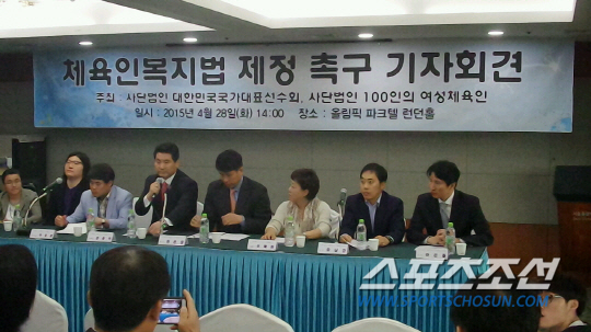'대한민국국가대표선수회'와 '100인의 여성체육인'은 28일 오후 2시 올림픽파크텔 런던홀에서 체육인복지법 제정을 촉구하는 기자회견을 가졌다. 장윤창 대한민국국가대표선수회 회장을 비롯해 유남규 장미란 조혜정 이은철 등 왕년의 스포츠스타들이 참석했다.
