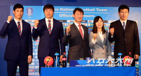 30일 오전 서울 종로구 신문로 축구회관 다목적회의실에서 여자축구대표팀 윤덕여 감독이 2015 캐나다 여자월드컵에 출전하는 여자축구대표팀 26명의 명단을 발표했다. 기자회견을 마치고 대표팀 코칭 스태프 송준섭 피지컬 코치, 정성천 코치, 윤덕여 감독, 김은정 코치, 김범수 GK코치(왼쪽부터)가 포즈를 취하고 있다. 송정헌 기자 songs@sportschosun.com/2015.04.30 |