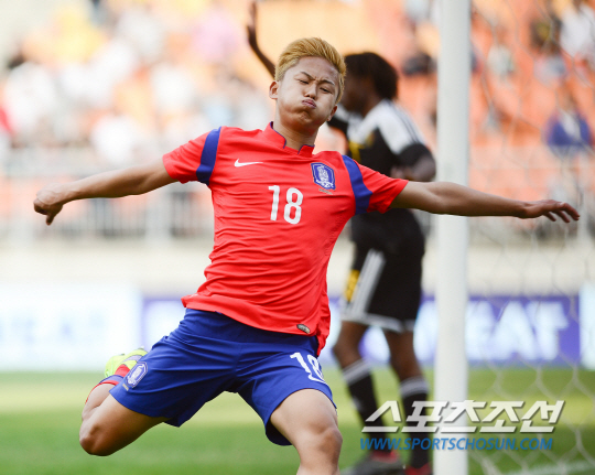 대한민국과 벨기에가 1일 오후 수원 월드컵경기장에서 열린 2015 수원 JS컵 국제청소년 축구대회(U-18)에서 맞대결을 펼쳤다. 한국 이승우가 골을 넣는데 실패한 후 광고 보드를 향해 공을 차며 아쉬워하고 있다.