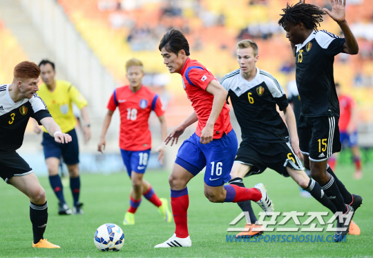 대한민국과 벨기에가 1일 오후 수원 월드컵경기장에서 열린 2015 수원 JS컵 국제청소년 축구대회(U-18)에서 맞대결을 펼쳤다. 한국 한찬희가 벨기에 수비를 따돌리며 문전으로 파고들고 있다.