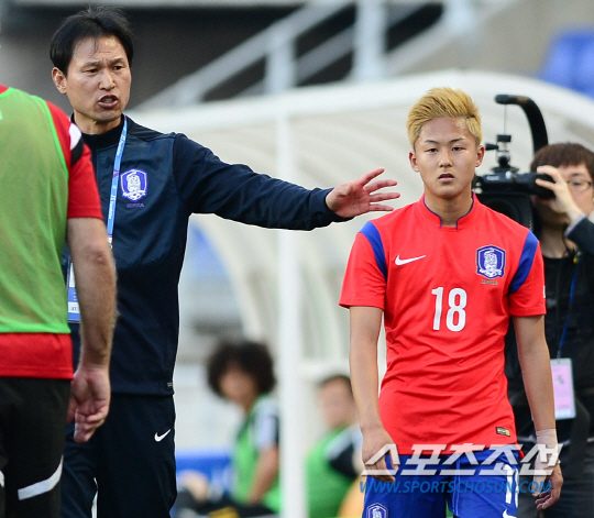 대한민국과 벨기에가 1일 오후 수원 월드컵경기장에서 열린 2015 수원 JS컵 국제청소년 축구대회(U-18)에서 맞대결을 펼쳤다. 한국 이승우가 후반 초반 교체되어 나오고 있다. 안익수 감독이 이승우를 향해 무언가 말을하고 있다.
