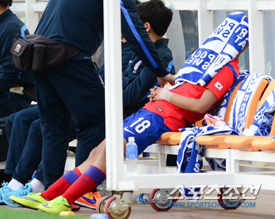 대한민국과 벨기에가 1일 오후 수원 월드컵경기장에서 열린 2015 수원 JS컵 국제청소년 축구대회(U-18)에서 맞대결을 펼쳤다. 한국 이승우가 후반 초반 교체된 후 벤치에서 수건을 뒤집어 쓴 채 아쉬워하고 있다.