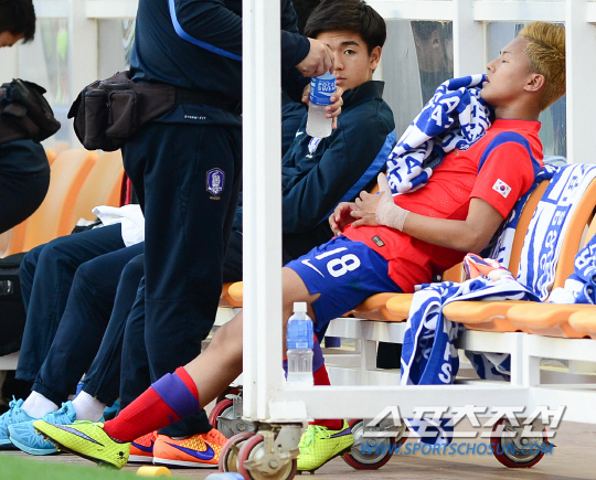 대한민국과 벨기에가 1일 오후 수원 월드컵경기장에서 열린 2015 수원 JS컵 국제청소년 축구대회(U-18)에서 맞대결을 펼쳤다. 한국 이승우가 후반 초반 교체된 후 벤치에서 수건을 뒤집어 쓴 채 아쉬워하고 있다.