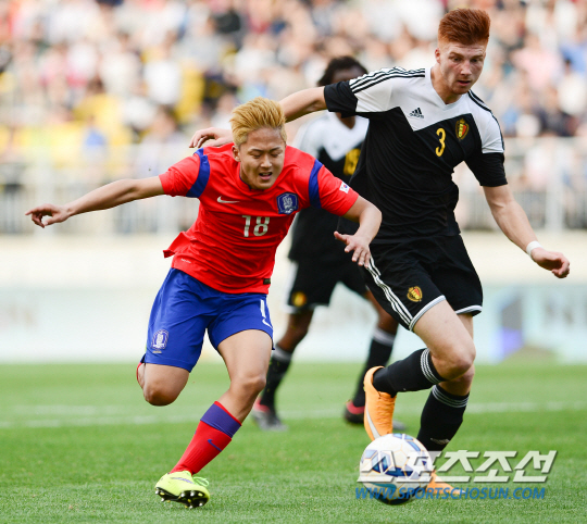대한민국과 벨기에가 1일 오후 수원 월드컵경기장에서 열린 2015 수원 JS컵 국제청소년 축구대회(U-18)에서 맞대결을 펼쳤다. 한국 이승우가 골문을 향해 돌진하다 벨기에 코프리에즈의 수비에 걸려 넘어지고 있다. 수원=정재근 기자 cjg@sportschosun.com