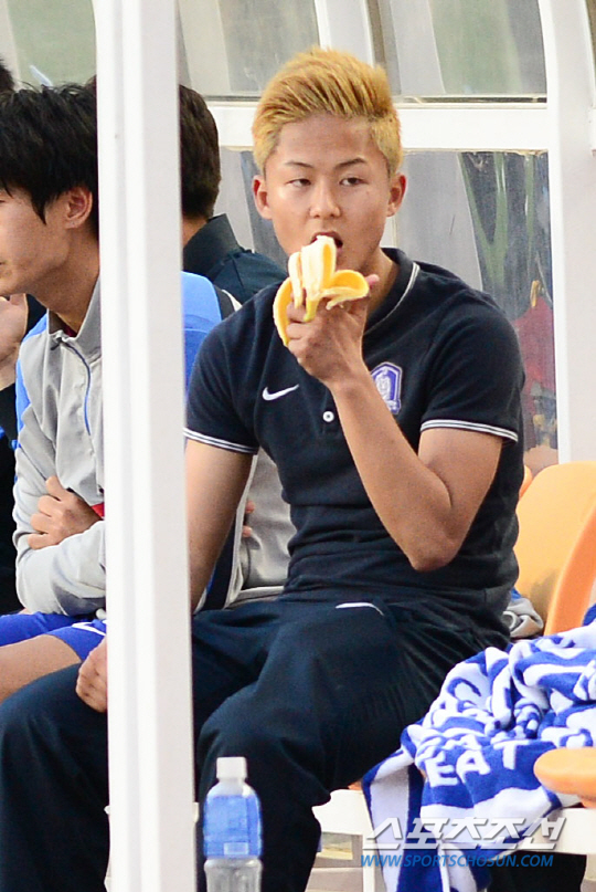 대한민국과 벨기에가 1일 오후 수원 월드컵경기장에서 열린 2015 수원 JS컵 국제청소년 축구대회(U-18)에서 맞대결을 펼쳤다. 한국 이승우가 후반 초반 교체된 후 유니폼을 갈아입고 나와 벤치에서 바나나를 먹고 있다.