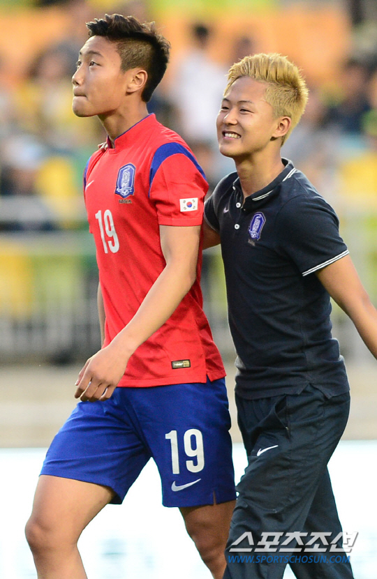 대한민국과 벨기에가 1일 오후 수원 월드컵경기장에서 열린 2015 수원 JS컵 국제청소년 축구대회(U-18)에서 맞대결을 펼쳤다. 0-0 무승부로 경기가 끝난 가운데 후반 초반 교체되어 나온 이승우와 종료 2분 전 투입된 백승호가 관중석으로 향하고 있다. 2분 밖에 뛰지 못한 백승호의 표정에 아쉬움이 가득하다!