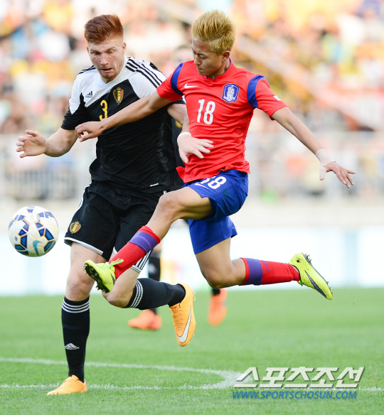 대한민국과 벨기에가 1일 오후 수원 월드컵경기장에서 열린 2015 수원 JS컵 국제청소년 축구대회(U-18)에서 맞대결을 펼쳤다. 한국 이승우가 벨기에 코프리에즈를 제치며 골문으로 파고들고 있다.