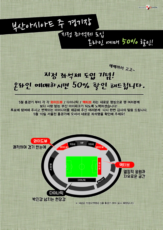 부산 아이파크가 올 시즌 단계적으로 지정좌석제를 추진 중인 가운데 오는 10일 FC서울전을 치르는 부산 아시아드주경기장에서 첫 공개를 한다.