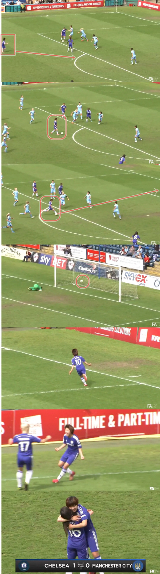 러시아와의 A매치 2연전을 치른 후 팀에 복귀하자마자 이어진 4월 12일 '강호' 아스널과의 FA컵 8강전, 전반 17분 특유의 날선 코너킥으로 캡틴 케이티 채프먼의 헤딩선제골을 도왔다. 2대1로 승리하며 4강행을 견인했다. 4월 26일부터 5월 4일까지 8일간 3경기를 치렀다. 26일 버밍엄시티 원정에서 1대0으로 승리했고, 5월1일 아스널과의 리그 홈경기에서 0대0으로 비겼다. 살인적 일정속에 사흘만에 치러진 이날 맨시티와의 4강전에서도 지소연은 한치 물러섬이 없었다. 천금의 결승골로 끝내 첼시의 창단 첫 결승행 역사를 썼다.
