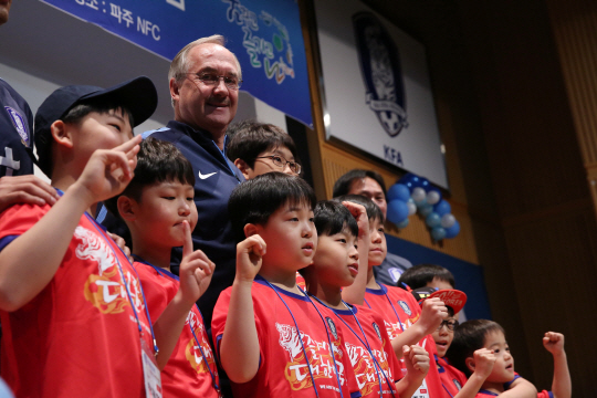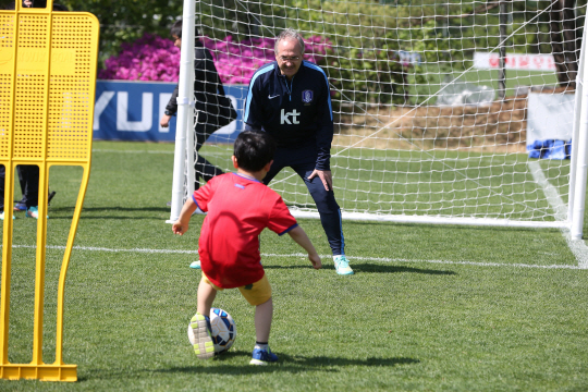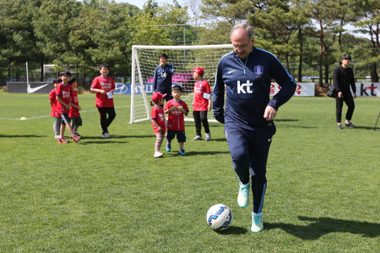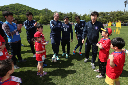 '어린이날 소원이 무엇이냐'는 장내 아나운서의 질문에 어린이들은 울리 슈틸리케 A대표팀 감독의 이름을 외쳤다. 곧이어 울리 슈틸리케 A대표팀 감독이 등장했다. 10여분간 어린이들을 위한 '포토타임'이 진행됐다. 슈틸리케 감독의 따뜻한 미소는 동심과 하모니를 이뤘다. 미니 골대에 골키퍼로 나선 슈틸리케 감독이 공을 줍는 찰나, 어린이가 찬 공이 엉덩이를 강타하자 슈틸리케 감독은 '아프다'는 듯한 익살스러운 표정을 지었다. 어린이날, 한국 축구의 요람인 파주NFC(국가대표팀 트레이닝센터)에는 웃음꽃이 만발했다.
