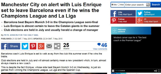 데일리 메일이 엔리케 감독의 사임설을 제기한 배경에는 바르셀로나 구단의 신임 회장 선출때문이다. 바르셀로나는 오는 7월 새로운 회장을 뽑아야 한다.