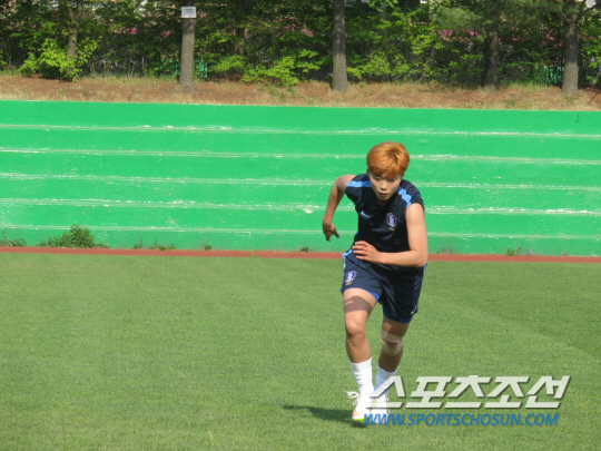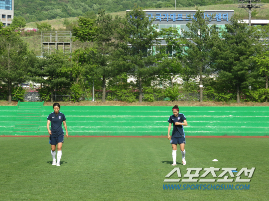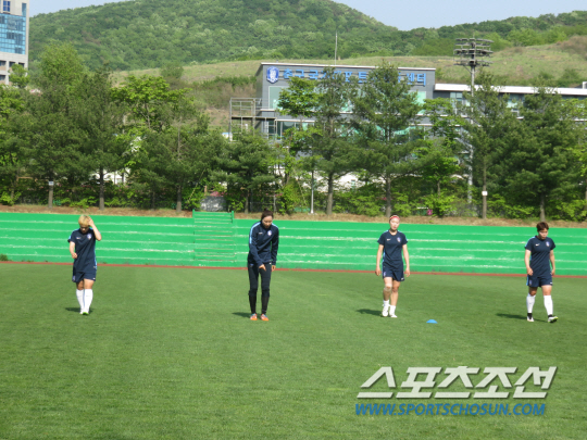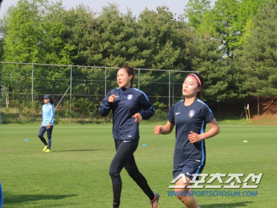 대형 스피커에서 스타트 신호음이 흘러나왔다. 가슴에 심박측정기를 부착한 선수들이 '스피커'의 구령에 따라 일사불란하게 움직이기 시작했다. 심서연, 임선주 등 최근 부상에서 갓 돌아온 선수들이 예정된 30회를 뛰고 뒤로 물러났다. 35회를 넘어서면서 고비가 찾아왔다. 봄날 오후, 태극낭자들의 '헉헉' 벅찬 숨소리가 파주 그라운드를 가득 메웠다. "포기하지마!" "이겨내야 돼" "할 수 있어!" 정성천 코치, 김은정 코치, 김범수 GK코치가 선수들과 함께 달리고, 박수를 치며 독려했다. "정미야, 좀더!" 1984년생 '맏언니' 골키퍼 김정미는 젖먹던 힘까지 다하는 투혼을 발휘했다. 목표했던 40회를 주파한 후에야 바닥에 쓰러졌다.