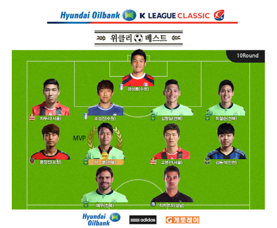 베스트 미드필더에는 정 훈을 비롯해 김동석(인천) 고명진(서울) 문창진(포항)이 포함됐다. 김동석과 고명진은 각각 9일 제주전과 10일 부산전에서 결승골의 주인공이 됐다.