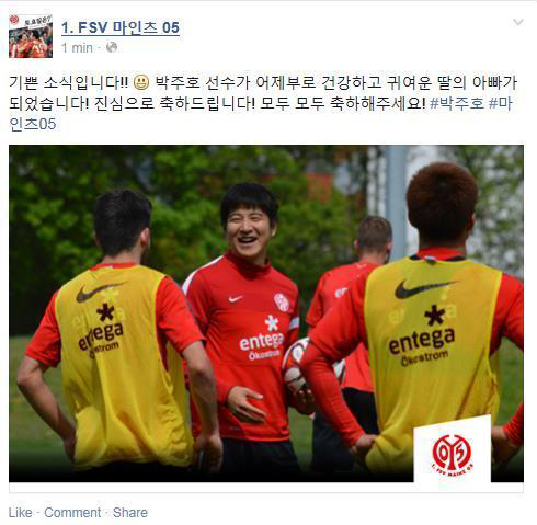 마인츠는 12일(한국시각) 한국 공식 SNS를 통해 '박주호의 여자친구가 현지시간으로 11일 오전 딸을 출산했다'고 발표했다.