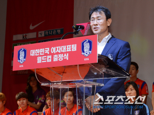 윤덕여 감독이 이끄는 여자 축구대표팀의 2015 FIFA 캐나다 여자월드컵 출정식이 18일 서울 광화문 올레스퀘어에서 열렸다. 윤덕여 감독이 인사말을 하고 있다. 내달 7일 개막하는 2015 FIFA 캐나다 여자월드컵에서 윤덕여 호는 내달 10일 브라질과 조별리그 E조 1차전을 치르는 것을 시작으로 14일에는 코스타리카, 18일에는 스페인과 맞붙는다. 광화문=허상욱 기자 wook@sportschosun.com