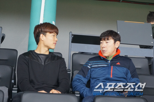 ◇17일 독일 브라운슈바이크 아인트라흐트 스타디온에서 올림픽대표팀 공격수 류승우가 독일 출장중인 신태용 올림픽대표팀 감독을 만나 이야기를 나누고 있다. 브라운슈바이크(독일)=이명수 스포츠조선 통신원