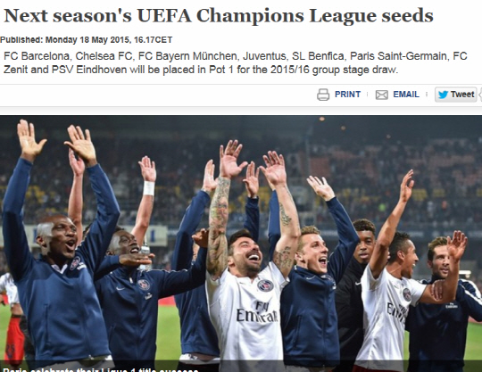 2015~2016시즌 유럽챔피언스리그 톱시드 8개팀이 확정됐다. UEFA는 19일(한국시간) 바르셀로나(스페인), 첼시(잉글랜드), 바이에른 뮌헨(독일), 유벤투스(이탈리아), 벤피카(포르투갈), 파리 생제르맹(프랑스), 제니트 상트 페테르부르크(러시아), PSV 에인트호번(네덜란드)이 다음 시즌 챔피언스리그에서 톱시드가 됐다고 밝혔다.