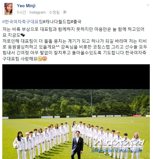 윤덕여 감독이 이끄는 여자축구대표팀은 20일 오전 캐나다월드컵을 앞두고 마무리 전훈지인 미국행 비행기에 올랐다. 단복까지 맞춰입었던 여민지는 마지막 순간 예기치 않은 부상으로 인해 아픔을 삼켜야 했다. 16일 능곡고와의 연습경기에서 왼무릎 십자인대가 파열된 여민지는 출정식이 있던 18일 오전 전치 8주 진단을 받았다. 예기치 않은 이별이었다. 지난 2년간 월드컵의 꿈 하나로 똘똘 뭉쳤던 대표팀 선후배들과 함께 눈물을 펑펑 쏟았다. 선수단이 공항에 도착한 이른 아침 7시경, 여민지도 깨어 있었다. 자신의 인스타그램에 대표팀 선후배들을 향한 응원의 글을 올렸다.
