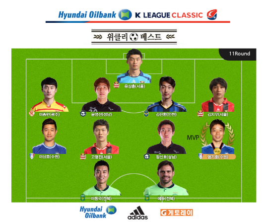 11라운드 최고의 공격수로는 전북의 투톱 이동국과 에두가 선정됐다. 염기훈과 함께 정선호(성남) 고명진(서울) 이상호(수원)가 이번 라운드를 빛낸 미드필더에 이름을 올렸고, 최고의 수비수는 김치우(서울) 김진환(인천) 윤영선(성남) 이종민(광주)이 차지했다. 철벽 수문장의 영예는 서울의 골키퍼 유상훈에게 돌아갔다. 베스트팀은 전북이었다. 전북은 대전을 2대1로 제압했고, 이 경기는 11라운드 베스트 매치에도 선정됐다.