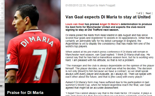 파리생제르맹이 디 마리아 영입에 큰 관심을 보이고 있다는 것은 더이상 특별한 얘기가 아니다. 지난 여름 파리생제르맹은 디 마리아 영입을 시도했지만, 디 마리아는 6000만파운드에 맨유 유니폼을 입었다. 하지만 디 마리아는 예상 외로 부진한 모습을 보였다. 디 마리아는 부상과 부진, 적응 실패 등이 겹치며 혹독한 맨유 데뷔 시즌을 보냈다. 디 마리아는 인터뷰에서 "내 첫 시즌은 불만족스러웠다. 잉글랜드의 팬은 진짜 디 마리아를 보지 못했다. 나는 더 나은 모습을 보일 수 있다"고 재기를 다짐했다.