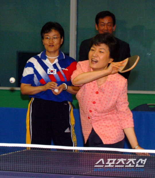 ◇헌정 사상 첫 여성대통령인 박근혜 대통령도 평소 스포츠로 몸과 마음을 단련한다. 특히 소문난 탁구 마니아다. 학교체육에서 시작한 탁구는 드라이브를 받아칠 정도의 실력을 갖췄다. 박근혜 대통령이 2004년 한나라당 대표 시절 아테네올림픽을 앞두고 태릉선수촌을 방문해 탁구를 치고 있다. 당시 탁구대표팀 감독이었던 이에리사 의원이 뒤에서 지켜보고 있다. 스포츠조선DB