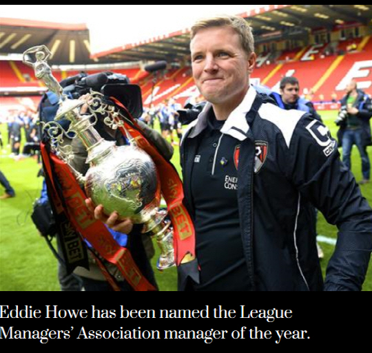 창단 125년 만에 처음으로 EPL 승격에 성공한 본머스의 에디 하우 감독이 리그감독협회(LMA) '올해의 감독상'을 수상했다. LMA는 27일(한국시각) 열린 시상식에서 챔피언십(2부 리그) 감독상 수상자인 하우 감독이 EPL 감독상을 받은 무리뉴 감독을 제치고 최고 상인 올해의 감독상을 받았다고 밝혔다.