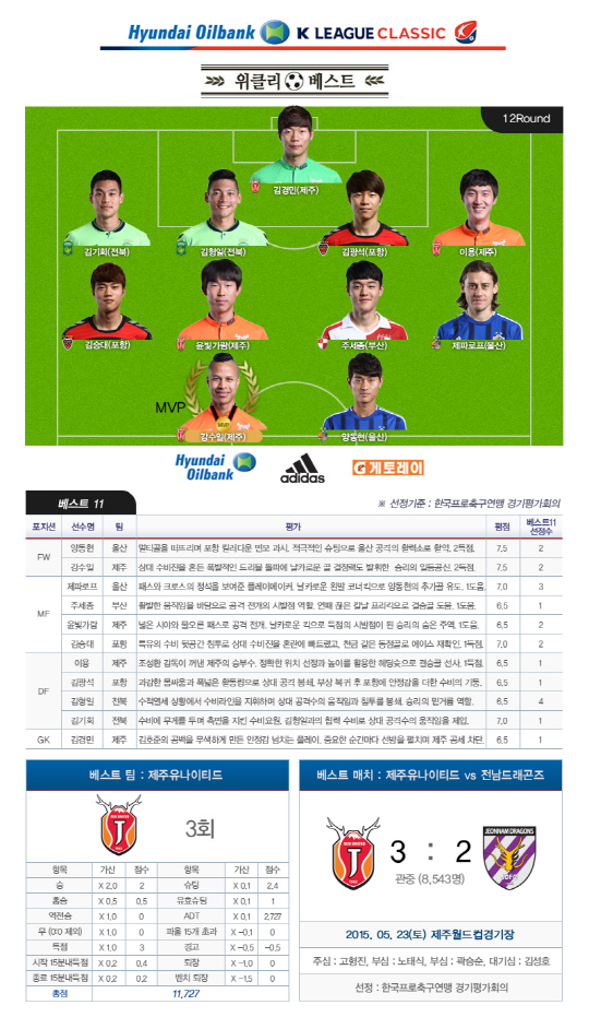 12라운드를 빛낸 베스트11도 공개됐다. 강수일과 함께 양동현(울산)이 최고의 공격수로 뽑혔다. 제파로프(울산) 주세종(부산) 윤빛가람(제주) 김승대(포항)가 최고의 미드필더로, 김기희 김형일(이상 전북) 김광석(포항) 이 용(제주)가 최고의 수비수로 선정됐다. 최고의 수문장은 제주의 김경민이 차지했다. 제주는 베스트팀과 베스트매치(대 전남전)에 모두 이름을 올렸다.