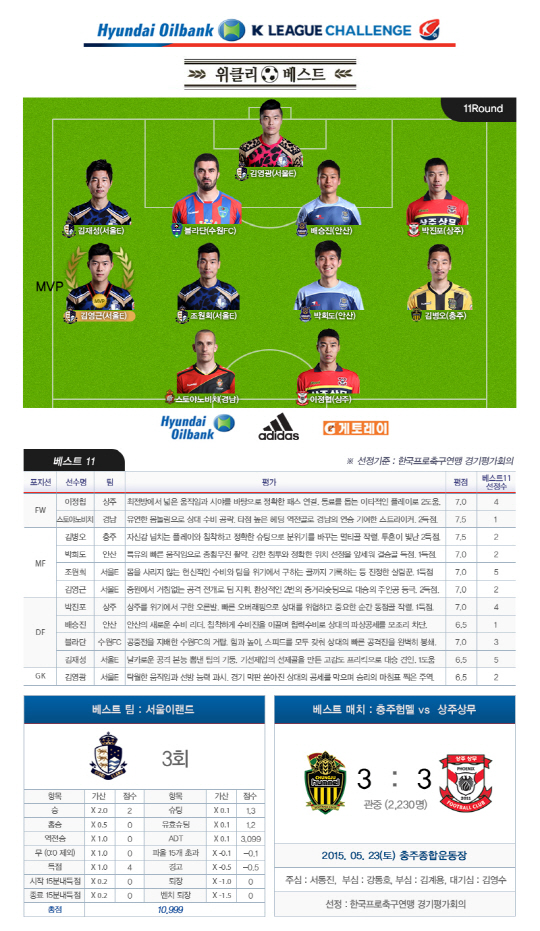 한편, 챌린지 11라운드 MVP는 2골을 넣은 김영근(이랜드)이 차지했다. 김영근을 비롯해 스토야노비치(경남) 이정협(상주·이상 FW) 김병오(충주) 박희도(안산) 조원희(이랜드·이상 MF) 박진포(상주) 배승진(안산) 김재성(이랜드) 블라단(수원FC·이상 DF) 김영광(이랜드·GK)이 베스트 11에 선정됐다.