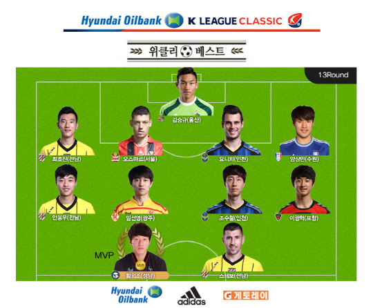 황의조가 2015년 현대오일뱅크 K리그 클래식 13라운드 최우수선수(MVP)로 선정됐다. 한국프로축구연맹은 2일 발표한 13라운드 위클리베스트에서 황의조의 이름을 맨 꼭대기에 올렸다. 프로연맹은 '매서운 움직임과 타고난 체력을 앞세워 상대 문전에서 정확하고 강력하 슈팅으로 역전승을 주도했다'며 황의조의 이름 앞에 별을 새겨 놓았다. 황의조는 주간 베스트11에서도 스테보 안용우 최효진(이상 전남) 이광혁(포항) 임선영(광주) 양상민(수원) 요니치(인천) 오스마르(서울) 김승규(울산)와 함께 나란히 이름을 올렸다. 황의조의 원맨쇼로 피날레를 장식한 성남-전북전은 13라운드 베스트 매치로 꼽혔다. 대전을 2대1로 꺾은 포항은 주간 베스트팀에 선정됐다.