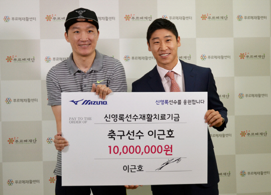 이근호는 2일 서울 종로구 푸르메센터에서 푸르메재단에 장애 어린이를 위한 재활병원 건립기금 4000만원을 전달했다.