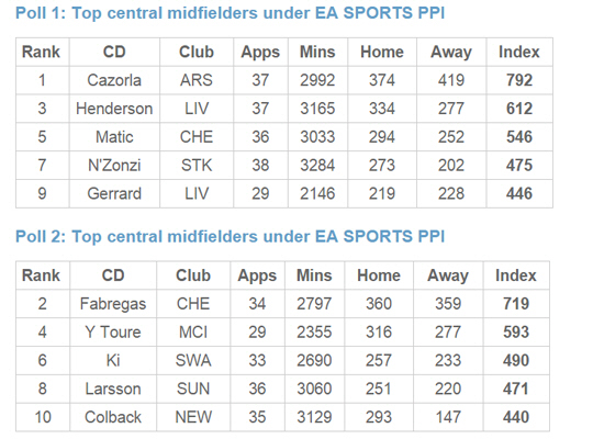 산티 카솔라(아스널)가 리그 최고의 중앙 미드필더로 꼽혔고, 세스크 파브레가스(첼시)가 뒤를 이었다. 조던 헨더슨(리버풀), 야야 투레(맨시티), 네마냐 마티치(첼시), 기성용이 뒤따랐다. 스티브 은존지(스토크시티), 세바스티안 라르손(선더랜드), 스티브 제라드(리버풀), 잭 콜백(뉴캐슬)이 10위 안쪽을 형성했다.