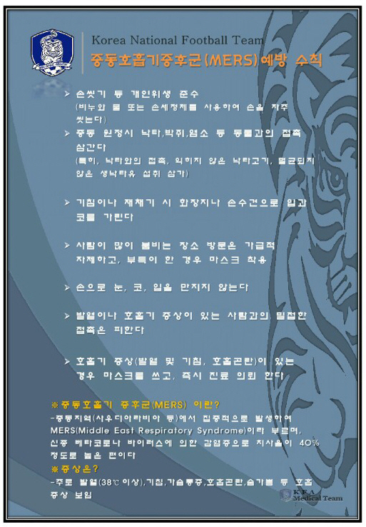 출항 전부터 예방에 심혈을 기울이고 있다. 8일 파주NFC에 소집된 23인의 태극전사들은 입소와 동시에 마스크와 손소독제를 지급 받았다. 대표팀 관계자는 "대표팀 개인 훈련 용품을 지급하면서 마스크와 소독제도 개별적으로 나눠줬다"면서 "전화상으로 매일 선수들의 체온 점검을 했고, 파주에 소집되자마자 체온 검사부터 했다"고 밝혔다. 온·오프라인을 통한 예방 교육도 이어졌다. 대표팀 명단이 발표된 이후 협회 의무팀이 만든 '메르스 예방 수칙'을 선수들에게 메시지로 보냈고, 파주에서도 소집 이후 예방 교육을 따로 실시했다.
