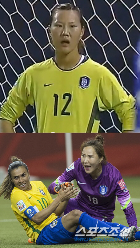 이날 '맏언니' 김정미는 분투했다. 마르타, 포르미가, 크리스티안, 안드레사 알베스, 타미레스 등 매서운 공격라인이 쉴새없이 쏘아올린 14개의 슈팅에 맞서 몸을 던졌다. 62%의 압도적인 점유율속에 파상공세를 펼치는 브라질을 상대로 최선을 다했다. 후반 8분 '브라질 레전드' 마르타에게 페널티킥을 허용한 장면은 뼈아팠다. 12년전 악몽이 재현됐다. 조별리그 1차전에서 월드컵 첫골을 내준 그녀에게 월드컵 통산 15호골 최다골 기록을 내줬다. 12년만의 설욕을 꿈꿔온 김정미로서는 아쉬운 장면이었다.