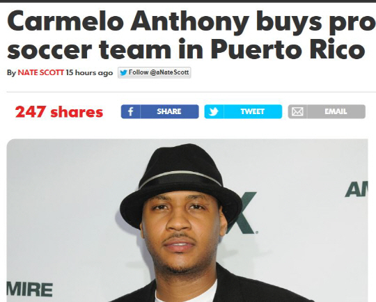 미국프로농구(NBA) 슈퍼스타 카멜로 앤서니(31·뉴욕 닉스)가 프로축구단의 구단주로 변신해 화제에 올랐다.
