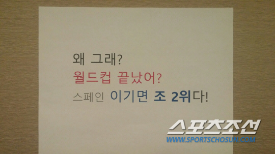 '왜 그래? 월드컵 끝났어? 스페인 이기면 조2위다!' 희망의 메시지를 써붙였다. 휴대폰 단체 메신저를 통해, 개인 메시지를 통해 용기를 불어넣었다.