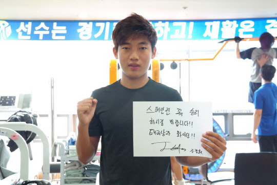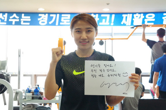 스페인과의 조별리그 3차전을 앞두고 여민지는 언니들을 위한 마음의 응원을 준비했다. '언니들 믿어요! 우린 할 수 있어요. 힘을 내요 슈퍼파월~'이라는 응원문구를 꼭꼭 눌러썼다. 환한 미소와 함께 주먹을 불끈 쥐어보였다. 여민지는 '지메시' 지소연(24·첼시레이디스)에게 골 세리머니를 재촉했다. 지소연은 코스타리카전에서 페널티킥 동점골을 넣고도 세리머니를 제대로 하지 못했다. "쫓아가는 상황이어서 세리머니를 할 분위기가 아니었다. 민지를 위한 세리머니를 해주려고 했는데…"라며 아쉬워했다. 여민지는 "소연언니한테 골 세리머니 언제 해줄 거냐고 묻고 싶네요"라며 '돌직구' 압력(?)을 행사했다. 골도 넣고, 승리하라는 응원이자, 메시지다. A매치 최다골 기록(77경기 39골)을 이어가고 있는 지소연이 스페인전에서 골을 터뜨릴 경우 A매치 40호골의 위업을 달성하게 된다. '바르셀로나 유망주' 장결희 역시 '태극낭자' 누나들을 향한 힘찬 응원의 메시지를 보냈다. '스페인전 꼭 승리하시길 바랍니다! 태극낭자 화이팅!' 오타와(캐나다)=전영지 기자 sky4us@sportschosun.com