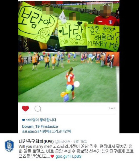 대한축구협회는 15일 공식 SNS에 "Will you marry me? 코스타리카전이 끝난 직후, 현장에서 펼쳐진 영화 같은 로맨스. 바로 중앙 수비수 황보람 선수가 남자친구에게 프러포즈를 받았다고♥"라는 글과 함께 황보람 선수의 SNS 글을 링크했다.