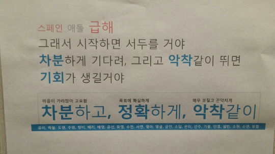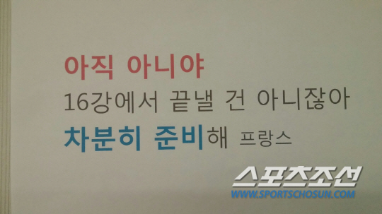 '이겨야 하는 게임' 스페인전을 앞두고 새로운 메시지가 붙었다. '스페인 애들 급해, 그래서 시작하면 서두를 거야, 차분하게 기다려, 그리고 악착같이 뛰면 기회가 생길거야'라고 풀어쓴 후 '(마음이 가라앉아 고요함)차분하고, (목표에 확실하게)정확하게 (매우 모질고 끈덕지게)악착같이'라고 썼다. '필승 미션' 아래 23명 선수들의 이름을 하나하나 새기며, '원팀'의 의지를 다졌다.