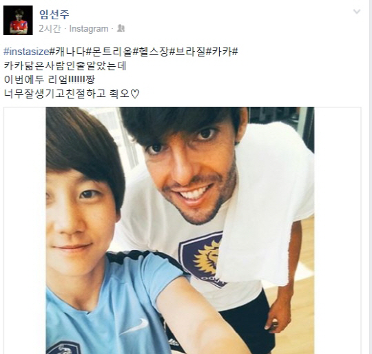임선주는 20일(한국시각) 오후 캐나다 몬트리올 근교 라발에서 가진 전술 훈련을 소화한 후 숙소인 상트르드쉐라톤몬트리올호텔 헬스장을 찾았다. 22일 프랑스와의 16강전에 대비해 틈만 나면 개인훈련을 이어가고 있다. 조별리그 2-3차전에서 선발로 출전해 풀타임을 소화한 황보람이 경고누적으로 프랑스와의 16강전에 나서지 못한다. 현재 남은 센터백 자원은 심서연 김도연 임선주다. 심서연이 3경기를 모두 뛰었고, 김도연은 브라질과의 1차전에 선발로 나섰다. 임선주는 코스타리카전 후반 39분 교체투입됐다. 스페인전에서 극적으로 역전승하며 16강에 진출한 후 임선주는 결전의 날을 위해 훈련, 또 훈련에 매진하고 있다. '몸만들기'를 위해 찾은 헬스장에서 뜻밖의 스타와 조우했다. 한때 전세계 여성 축구팬들의 '로망'이었던 브라질 미남 축구스타 카카였다. 임선주는 카카와 함께 운동중 다정하게 포즈를 취한 인증샷을 공개했다. 자신의 SNS에 사진과 함께 '캐나다, 몬트리올, 헬스장, 브라질, 카카'라는 태그와 함께 '카카 닮은 사람인 줄 알았는데 이번에도 리얼!!! 짱, 너무 잘생기고 친절하고 ?오' 라는 한줄 글을 달았다.