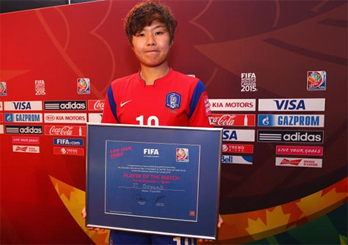 18일 캐나다월드컵 E조 조별리그 3차전 스페인전 직후 지소연은 경기 최우수선수로 선정됐다. '리브 유어 골, 플레이어 오브 더 매치' 상패를 들고 사진을 찍은 후 지소연은 "아, 이 상 내가 받아도 되는 거냐?"며 고개를 저었다. "내가 받을 상이 아니다. 이 상패에 선수들 이름을 모두 새기고 싶다"고 했다.