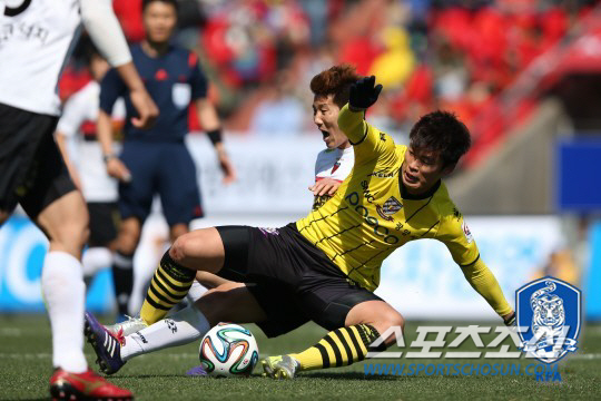 4경기 연속골을 기록중인 '경꼐대상 1호 윙어' 오르샤를 저지하기 위해 황 감독은 김준수를 내세웠다. "전북전에서 레오나르도를 잘 막아낸 준수를 믿는다. 비디오를 통해 오르샤의 스타일을 분석했다"고 했다. 노상래 전남 감독은 2경기 연속골을 기록중인 문창진, 2경기 연속 공격포인트를 기록중인 손준호를 묶기 위해 김영욱을 내세웠다. 포항전 키플레이어는 "김영욱"이라고 선언했다. 터프하고 활동량이 많은 미드필더 김영욱에게 중원에서 포항의 패스길을 끊어낼 것을 명했다. "영욱이가 포항 원정에서 유일하게 골을 넣었다"고 했다. 올시즌 첫 포항 원정에서 전남은 1대4로 패했다. 이날 전남은 추가시간, 김영욱의 끝까지 포기하지 않는 만회골에 힘입어 영패를 면했다. 상대의 장점을 무력화시키는 양팀 사령탑의 지략대결은 첨예했다. 용병술은 적중했다. 김준수는 오른쪽 측면에서 오르샤를 묶어냈다. 티아고와 측면에서 협력수비도 원활하게 이뤄졌다. 전반 중반 이후 왼쪽의 오르샤가 오른쪽의 안용우와 자리를 바꿨다. 김영욱 역시 중원에서 헌신적으로 뛰었다. 옐로카드를 불사했다. '투사' 김평래와 함께 볼란치로 서서 치열한 협력수비로 손준호, 문창진을 묶었다. 전반 양팀은 나란히 3개의 슈팅을 주고받았다. 유효슈팅도 나란히 1개씩 기록했다. 팽팽했다.
